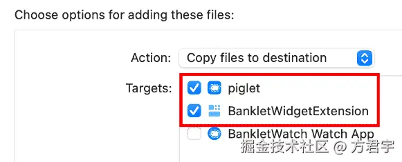这里使用Group或者Folder等形式,管理Gif图片。在导入图片时,需要在Target Membership中勾选主应用和小组件。