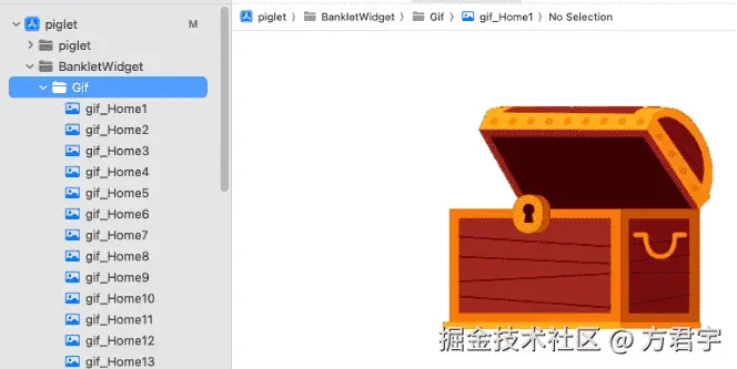 在Xcode小组件项目中,创建一个Gif组,将Gif图片拖入到这个组中。