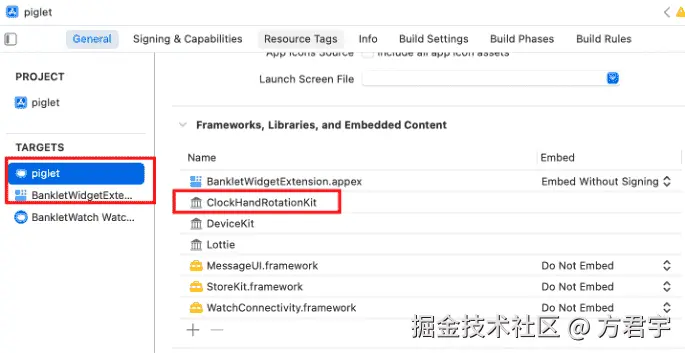 点击左侧的项目名称 -- TARGETS,分别检查主应用和小组件的General -- Frameworks, Libraries, and Embedded Content,是否包含ClockHandRotationKit框架。