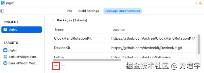 打开Xcode项目,点击左侧的项目名称 -- PROJECT -- 项目名 -- Package Dependencies,点击"添加"按钮,引入GitHub第三方库ClockHandRotationKit (github.com/octree/Cloc...)。