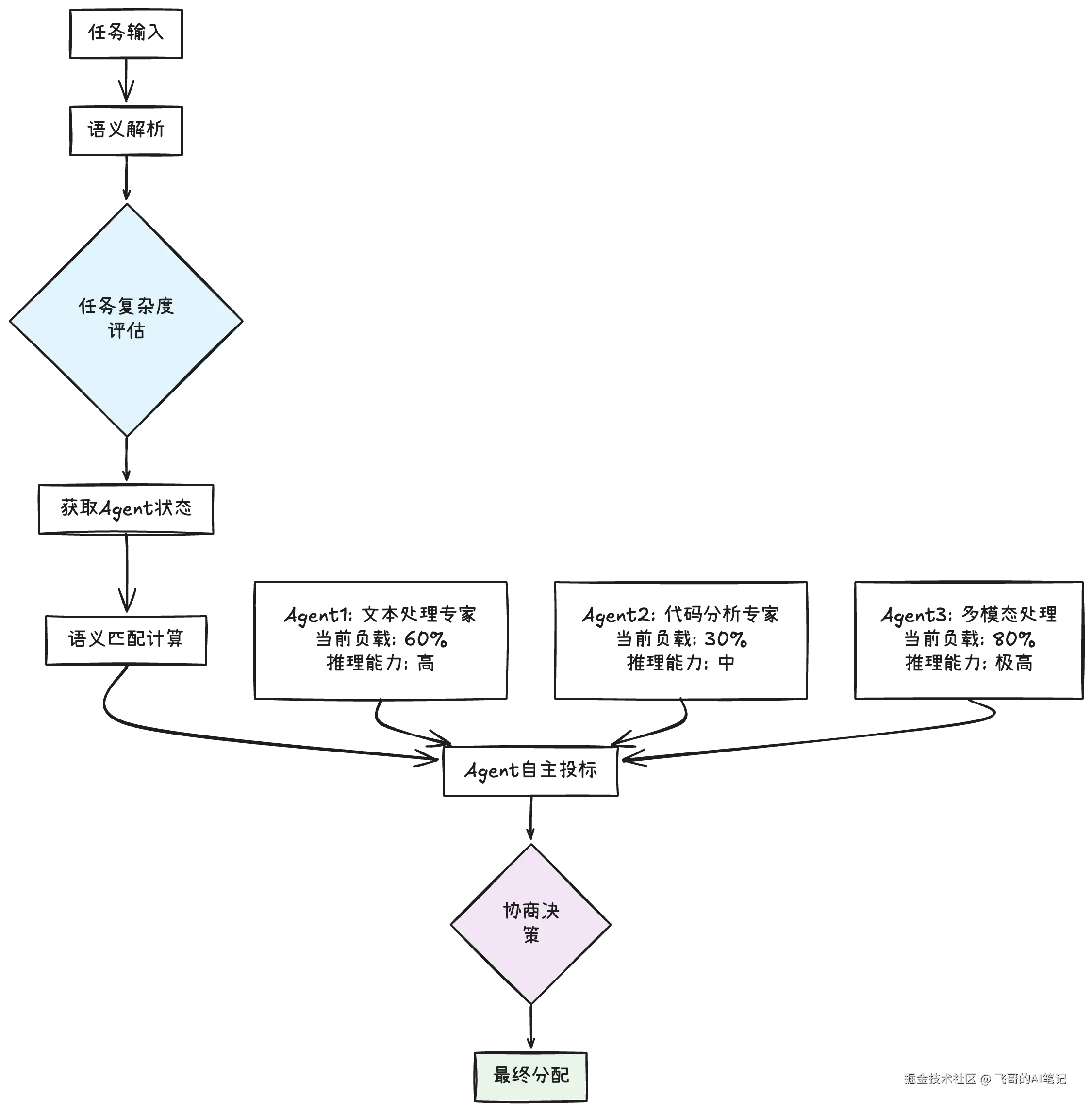 这个过程的关键创新是引入了语义匹配 和Agent自主评估。系统不再是简单的规则匹配,而是通过向量embedding计算任务与Agent能力的语义相似度,Agent也会基于对任务的理解主动决定是否参与竞标。