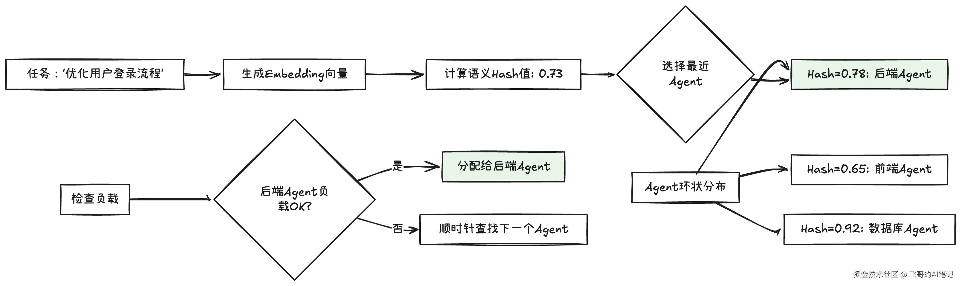 语义一致性哈希是现代负载均衡的核心创新。传统哈希只考虑数据分布,但AI任务有语义关联性。比如同一用户的多轮对话,或者同一项目的不同文件,分配给同一Agent能充分利用上下文记忆。