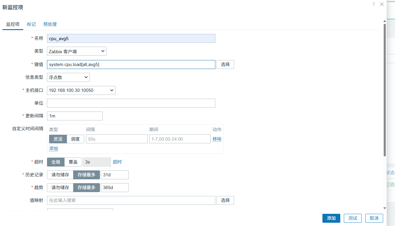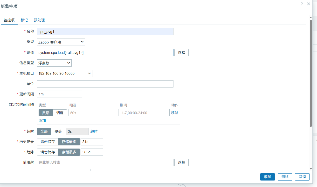 右上角创建监控项,名称自己写,键值选cpu负载,意味每隔1分钟cpu的负载情况