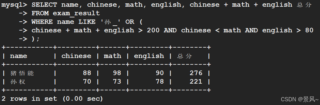 查询孙某同学,否则要求总成绩大于200分并且语文成绩小于数学成绩并且英语成绩大于80分
