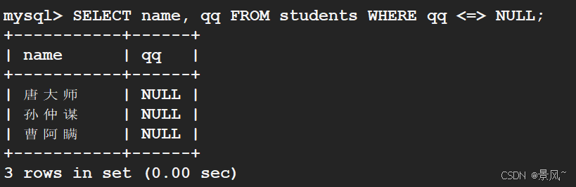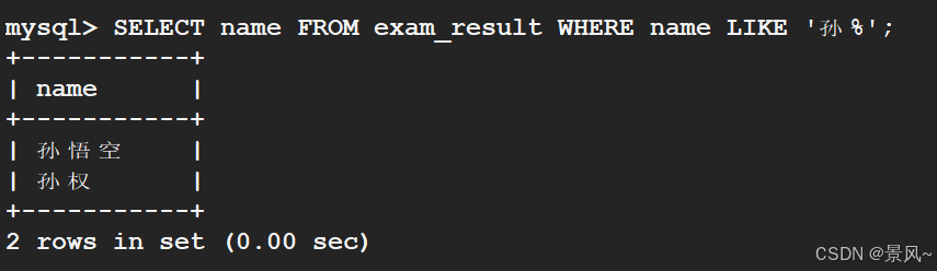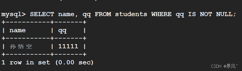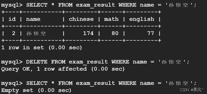 在删除数据之前,先查看孙悟空同学的相关信息,然后在delete语句中指明删除孙悟空对应的记录,并在删除后再次查看数据确保数据成功被删除。如下: