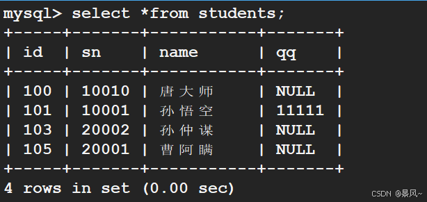 - 注意,这里在插入的时候,也可以不用指定id(当然,那时候就需要明确插入数据到那些列了),那么mysql会使用默认 的值进行自增。