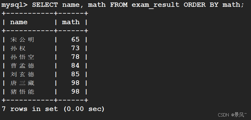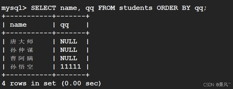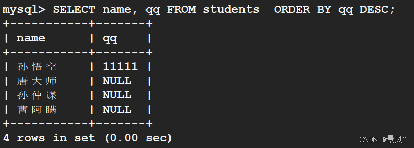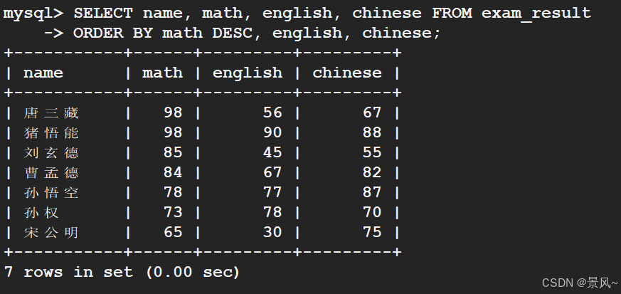 - 在排序的时候必须要有数据,因此可以先完成前面的查询动作,然后再根据题目要求进行排序。