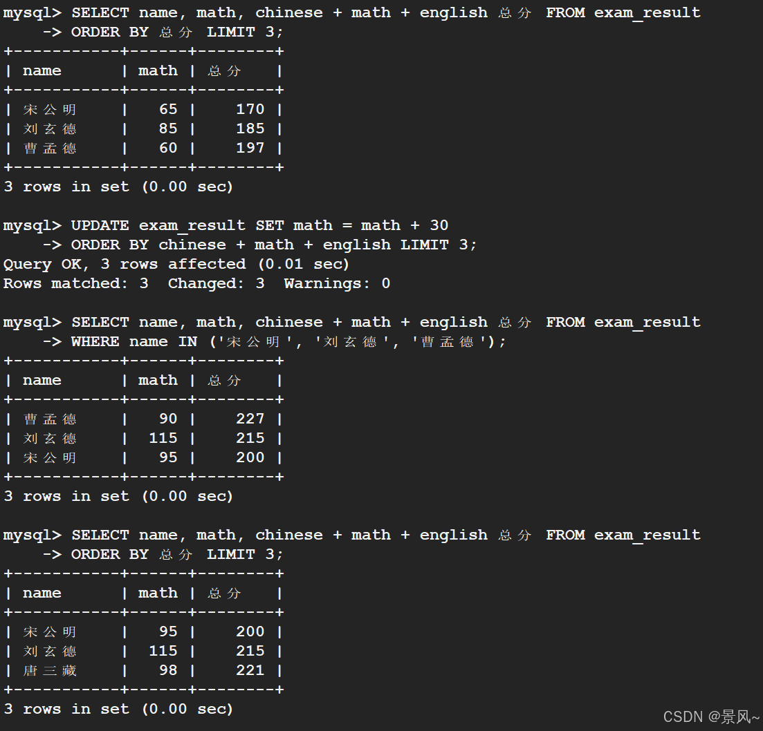 需要注意的是,MySQL中不支持+=这种复合赋值运算符,此外,这里在查看更新后的数据时不能查看总成绩倒数前三的3位同学,因为之前总成绩倒数前三的3位同学,数学成绩加上30分后可能就不再是倒数前三了。如下: