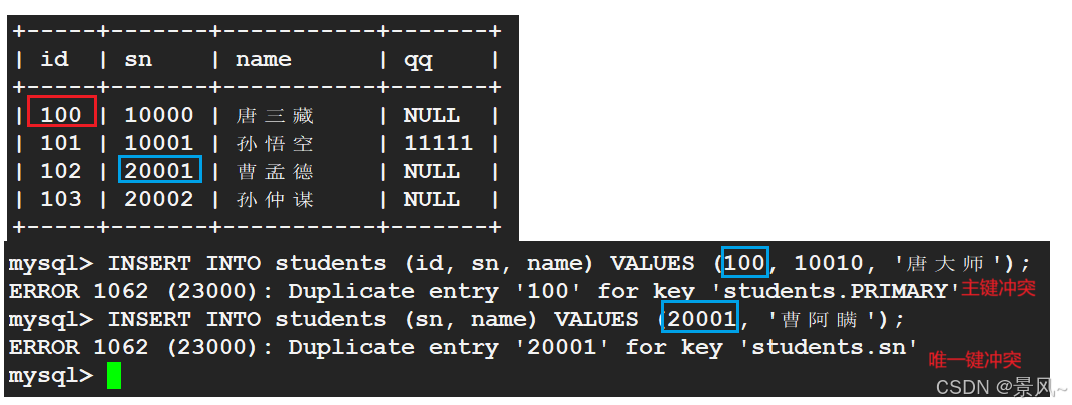向表中插入记录时,如果待插入记录中的主键或唯一键已经存在,那么就会因为主键冲突或唯一键冲突导致插入失败。如下: