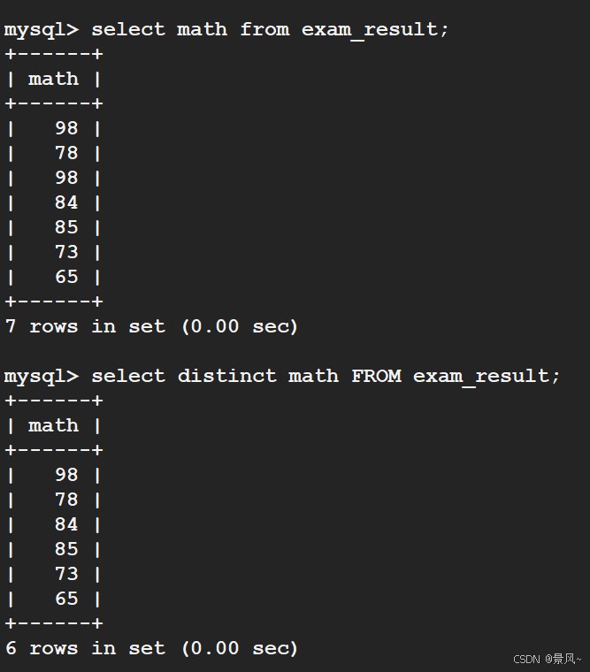 如果想要对查询结果进行去重操作,可以在SQL中的select后面带上distinct。如下: