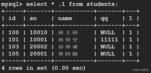 代替column列表(数据库表中的一列或多列数据字段),表示进行全列查询,这时将会显示被筛选出来的记录的所有列信息。如下: