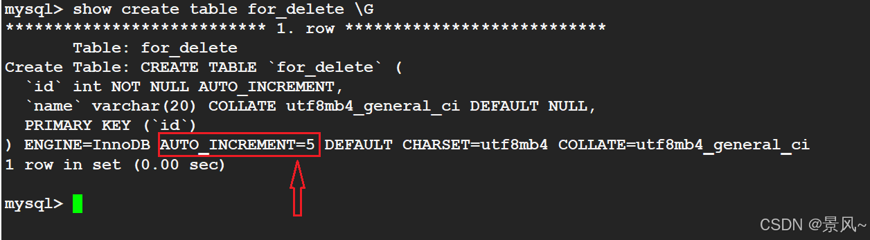 的字段,该字段表示下一次插入数据时自增长字段的值应该为n。当通过delete语句删除整表数据时,不会重置AUTO_INCREMENT=n