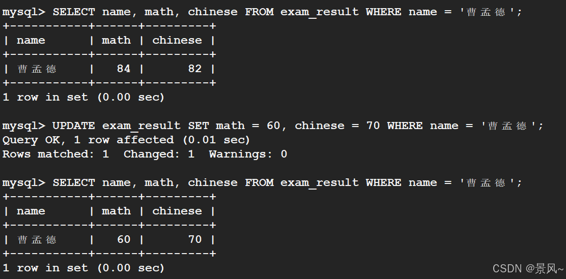 将曹孟德同学的数学成绩修改为60分,语文成绩修改为70分