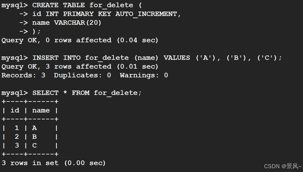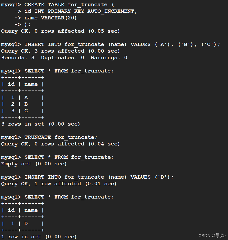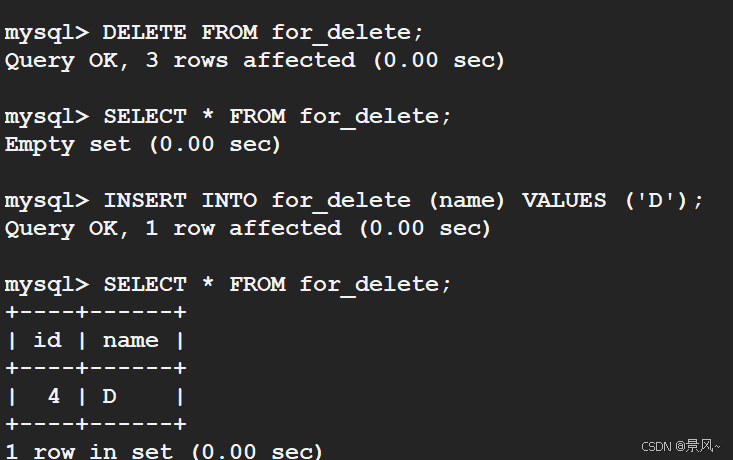 字段,因此删除整表数据后插入数据对应的自增长id值会在原来的基础上继续增长。如下: