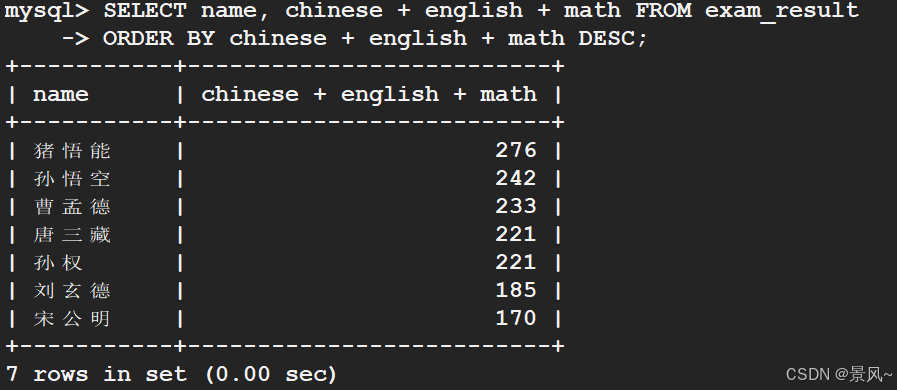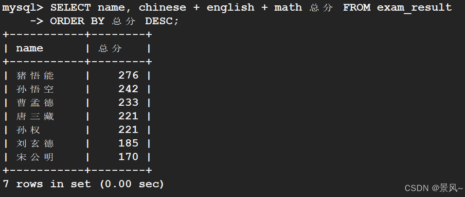 在select的column列表中指明要查询的列为姓名和总分(表达式查询),在order by子句中指明按照总分进行降序排序。如下:
