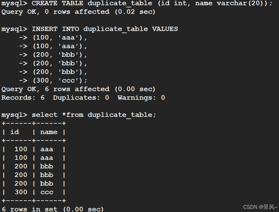 创建一张测试表,向测试表中插入一些测试数据,数据中存在重复的记录