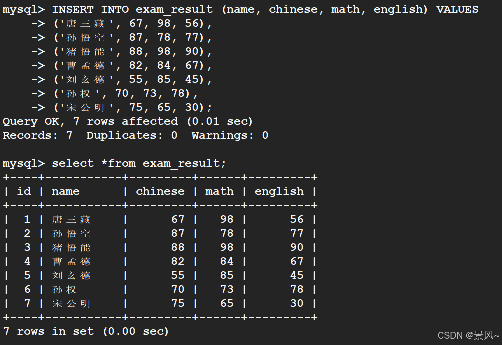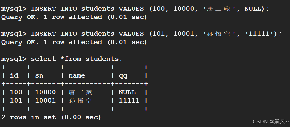 - 插入两条记录,value_list 数量必须和定义表的列的数量及顺序一致