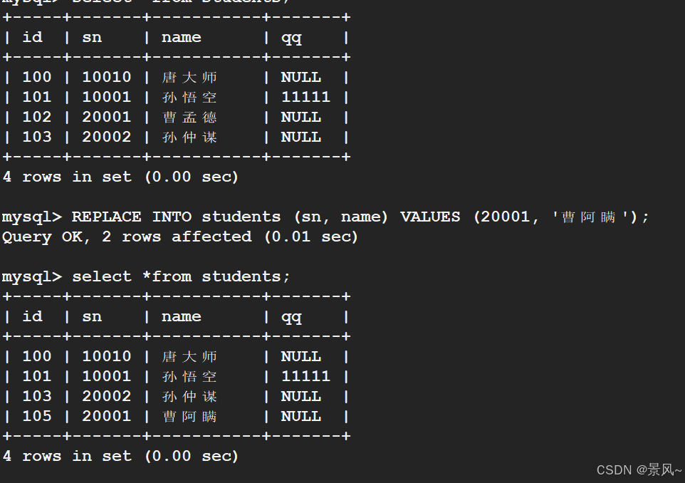 - 2 rows affected:表中有冲突数据,冲突数据被删除后重新插入。