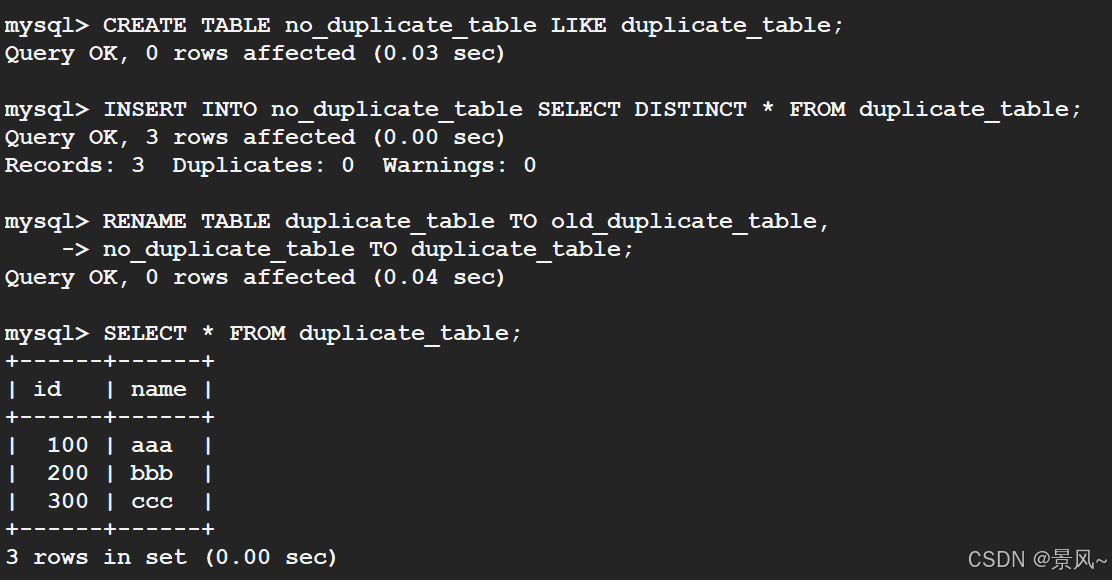 - 将测试表重命名为其他名字,再将临时表重命名为测试表的名字,实现原子去重操作。
