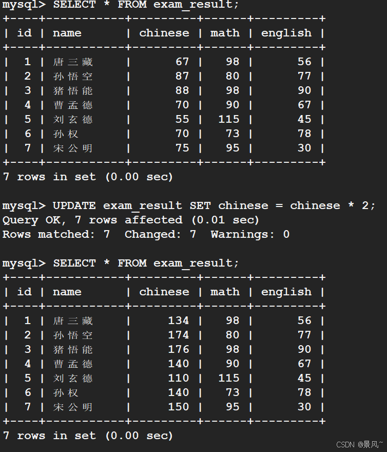 在update语句中指明要将筛选出来的记录的语文成绩变为原来的2倍,并在修改后再次查看数据确保数据成功被修改。如下: