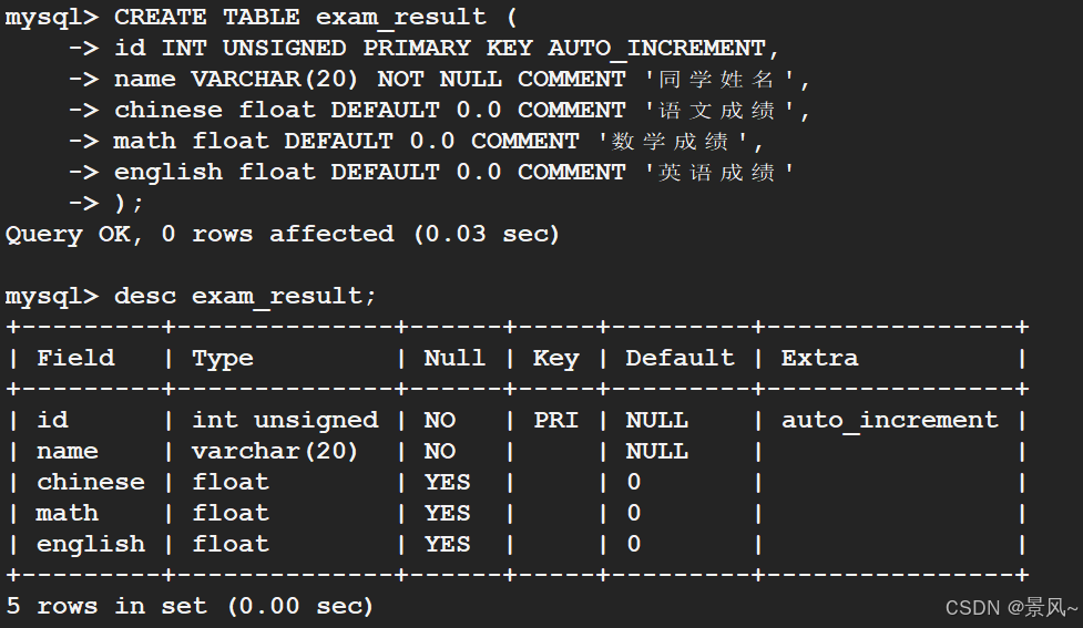 math float DEFAULT 0.0 COMMENT '数学成绩',