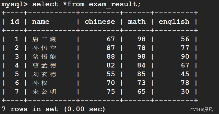 为了进行演示,下面创建一个期末成绩表,表当中包含自增长的主键id、姓名以及该同学的语文成绩、数学成绩和英语成绩。如下: