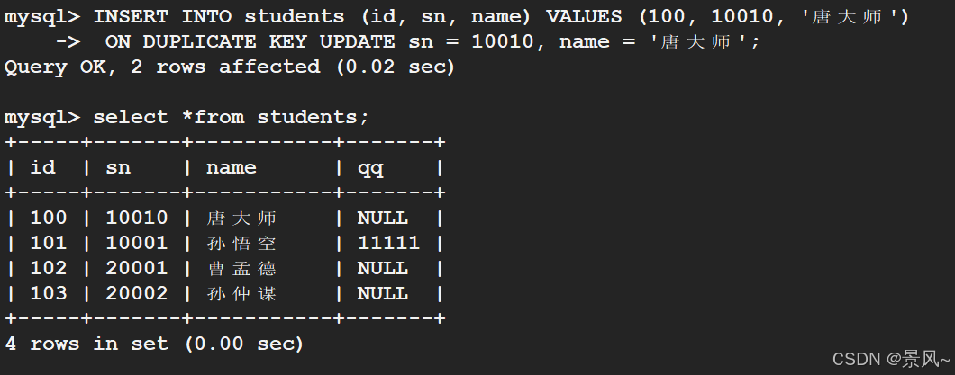 - 2 rows affected:表中有冲突数据,并且数据已经被更新。