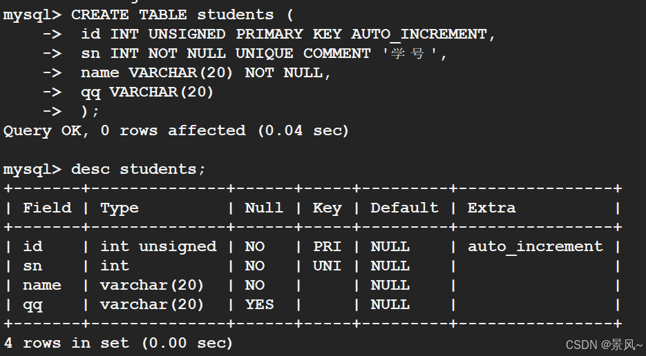 为了进行演示,下面创建一个学生表,表当中包含自增长的主键id、学号、姓名和QQ号。