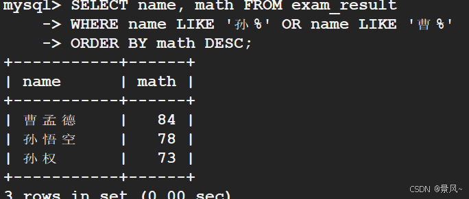 查询姓孙的同学或姓曹的同学及其数学成绩,按数学成绩降序显示