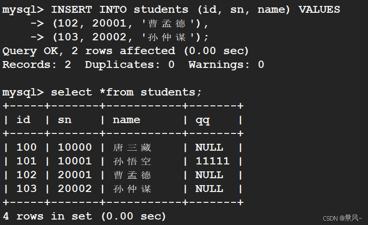 使用insert语句也可以一次向表中插入多条记录,插入的多条记录之间使用逗号隔开,并且插入记录时可以只指定某些列进行插入。如下: