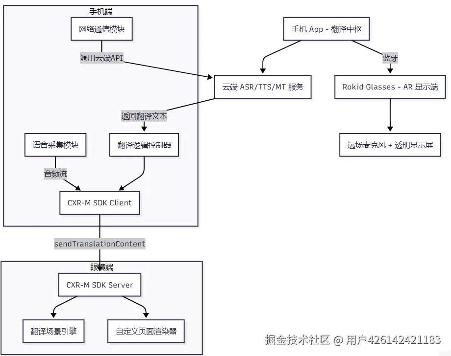 - 对方说话 → 眼镜远场拾音 → 手机 ASR → 云端翻译 → 眼镜 AR 显示佩戴者语言;
