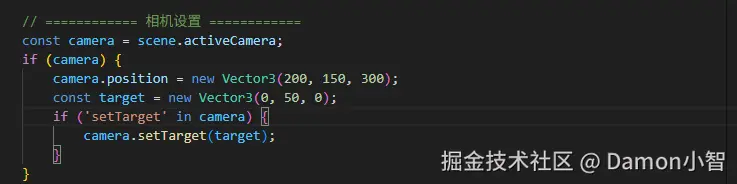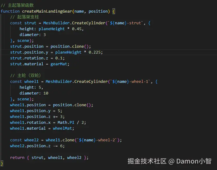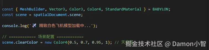 代码即场景 | 不需要导入外部 3D 模型,纯代码构建场景。这种方式虽然初期需要较多代码,但后期维护和动态生成非常灵活。 |