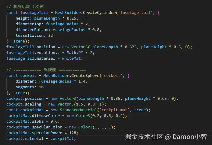 cockpit.scaling = new Vector3(1.5, 0.8, 1); // 拉伸变形const cockpitMat = new StandardMaterial('cockpit-mat', scene);