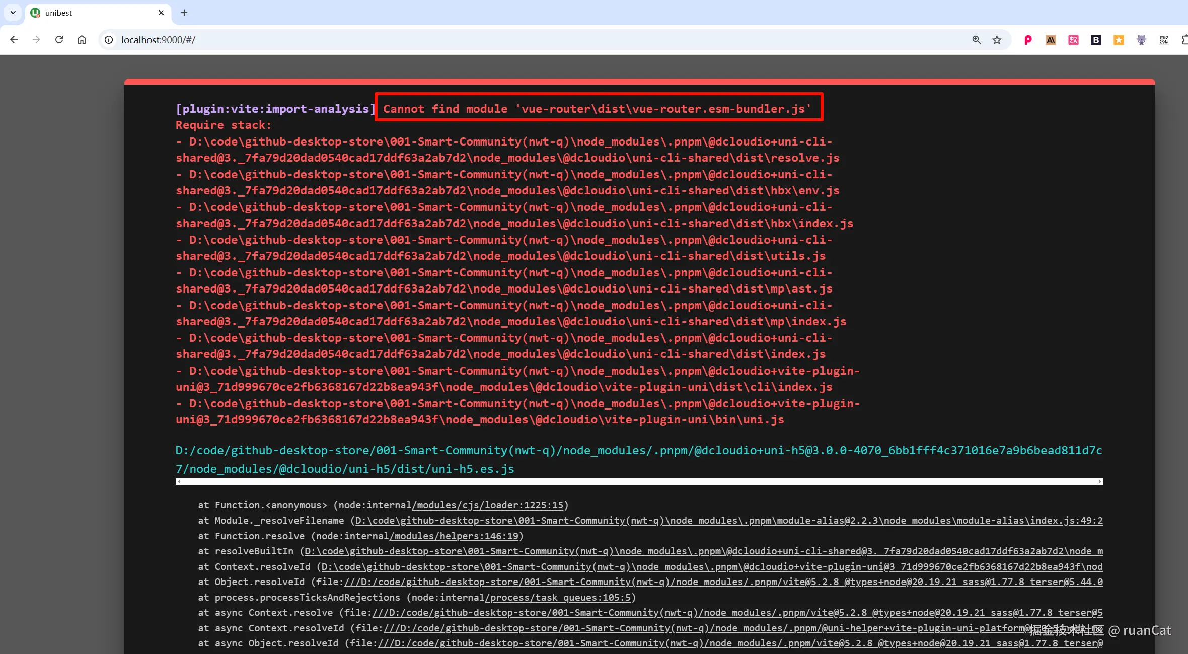 [commonjs--resolver] Cannot find module '/home/runner/work/001-Smart-Community/001-Smart-Community/node_modules/vue-router/dist/vue-router.esm-bundler.js'