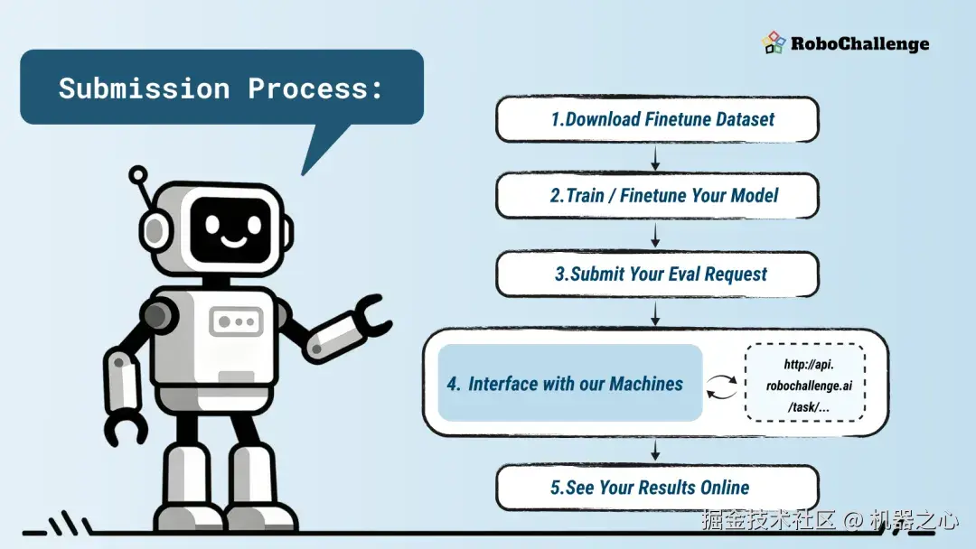 提交前需对接平台 API:通过提供框架代码,演示观察 - 推理 - 停止的完整交互逻辑,支持评估前的模型预热与动作队列稳定控制,并配套模拟测试以供验证。提交评估时需注明密钥、任务集及模型名称,多任务提交将视作通用模型处理。