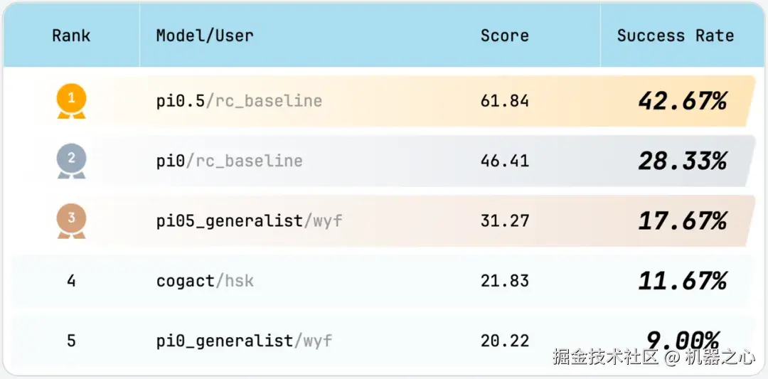 评估请求进入人工调度队列,因场景布置需数小时至数日完成。结果发布后,参与者可通过 rerun.io 查看器分析 RRD 格式的机器日志与视频。平台默认公开所有结果以促进交流,若对评分存疑可申请重新计算。
