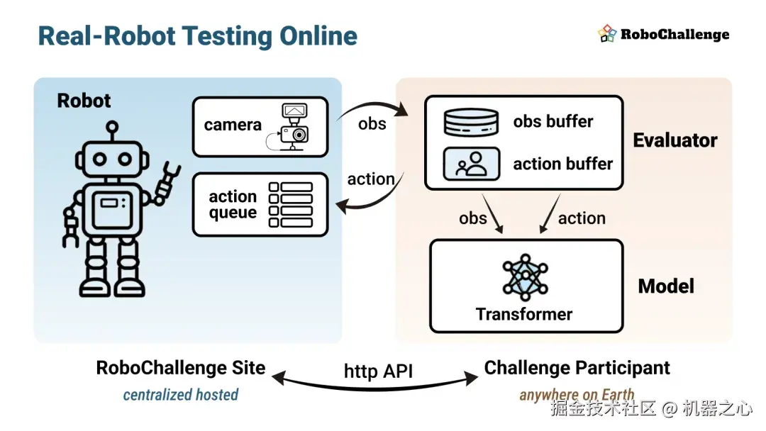 RoboChallenge 通过创新的「远程机器人」方法,为学术界和产业界提供高精度、易用、免费的在线机器人测试服务。该平台最大的特点之一是以云端化服务突破机器人测试的硬件资源限制,实现「没有机器人,一样做实验」的效果,为具身智能研究提供高效、可靠的算法验证环境。