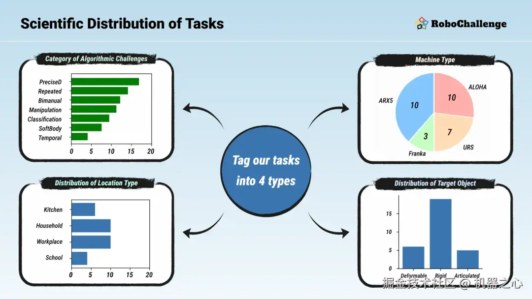 机器人正逐步融入现实世界,但目前仍缺乏统一、开放且可复现的基准测试方法,难以衡量技术进展或公平比较不同方法的优劣。改变这一现状需要构建一个大规模多任务的具身智能真机测试集,使得研发人员在统一环境中验证对比机器人算法,实现从基础任务到复杂现实应用场景的全面覆盖。