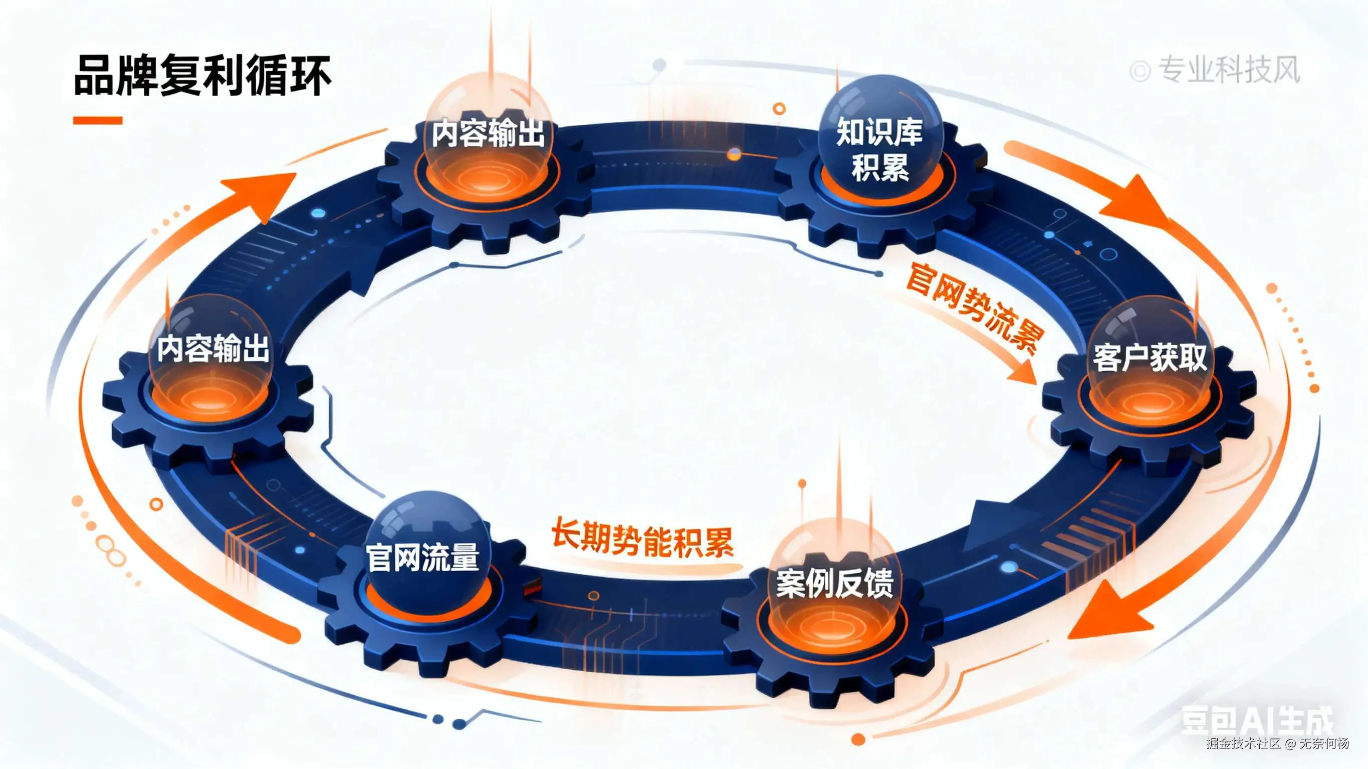 这就是品牌的复利循环。 每输出一篇内容、每做一次分享、每完成一个项目, 都在为你的品牌长期积累势能。