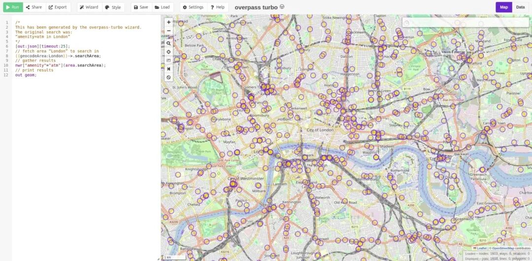 点击"构建并运行查询",向导会生成对应的查询代码并自动执行,最终在地图上显示伦敦所有ATM机的位置分布。