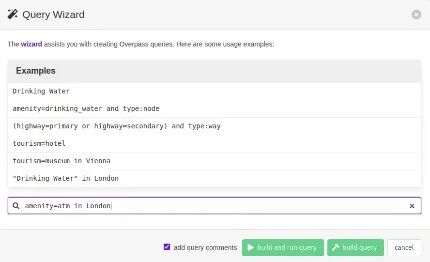 对于初学者,工具栏中的"向导"工具堪称神器。你只需用简单的英语输入搜索需求,向导就能自动将其转换为标准的Overpass QL语法。例如输入: