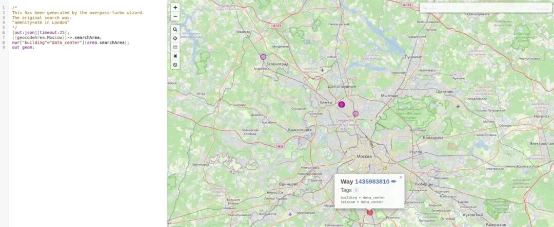 out:json\]\[timeout:25\]; // 定义搜索区域为"伦敦" {{geocodeArea:London}}-\>.searchArea; // 收集符合条件的结果 nwr\["amenity"="atm"\](area.searchArea); // 输出结果 out geom; 代码逐句解析 1. \[out:json\]\[timeout:25\]:设置输出格式为JSON,同时将服务器执行时间限制在25秒(避免查询过大导致超时)。 2. {{geocodeArea:London}}-\>.searchArea;:这是一个宏命令,用于解析伦敦的行政边界(对应OSM中的"关系"数据),并将结果存储到临时集合.searchArea中,方便后续调用。 3. nwr\["amenity"="atm"\](area.searchArea);:nwr是节点(node)、方式(way)、关系(relation)的缩写,代表查询OSM中的所有元素类型;\["amenity"="atm"\]是标签过滤器,筛选出所有标记为"ATM"的元素;(area.searchArea)则将搜索范围限定在之前定义的伦敦区域内。 4. out geom;:输出匹配到的元素,其中geom表示包含完整的几何信息------包括经纬度坐标、路径节点列表等。  OSM三大元素类型 • 节点(node):代表单个点位,如监控摄像头、Wi-Fi接入点。 • 方式(way):代表线条或封闭形状,如道路、建筑物轮廓。 • 关系(relation):代表元素组合,如建筑群、大学校园。 标签过滤器:精准提取的核心 侦察查询的关键在于标签过滤器,OSM中的标签均遵循"键=值"的结构,格式为node\["key"="value"\]。  你可以通过访问OSM的地图特征页面(https://wiki.openstreetmap.org/wiki/Map_features),查看所有可用的"键"和"值"。从安全侦察角度,重点关注man_made(人工设施)相关的键,能发现不少与监控相关的信息。  实战案例 1. 查询加利福尼亚州的监控摄像头 \[out:json\]\[timeout:25\]; {{geocodeArea:California}}-\>.searchArea; nwr\["surveillance"="camera"\](area.searchArea); out geom; 2. 查询莫斯科的数据中心 \[out:json\]\[timeout:25\]; {{geocodeArea:Moscow}}-\>.searchArea; nwr\["building"="data_center"\](area.searchArea); out geom;  通过查询和可视化OpenStreetMap的众包地理数据,侦察人员能大幅提升工作效率。无论是跟踪城市设施布局、排查监控覆盖场景,还是调查特定类型建筑,Overpass Turbo都能通过定制化查询,从OSM庞大的数据库中精准提取所需信息,成为安全侦察中的高效工具。