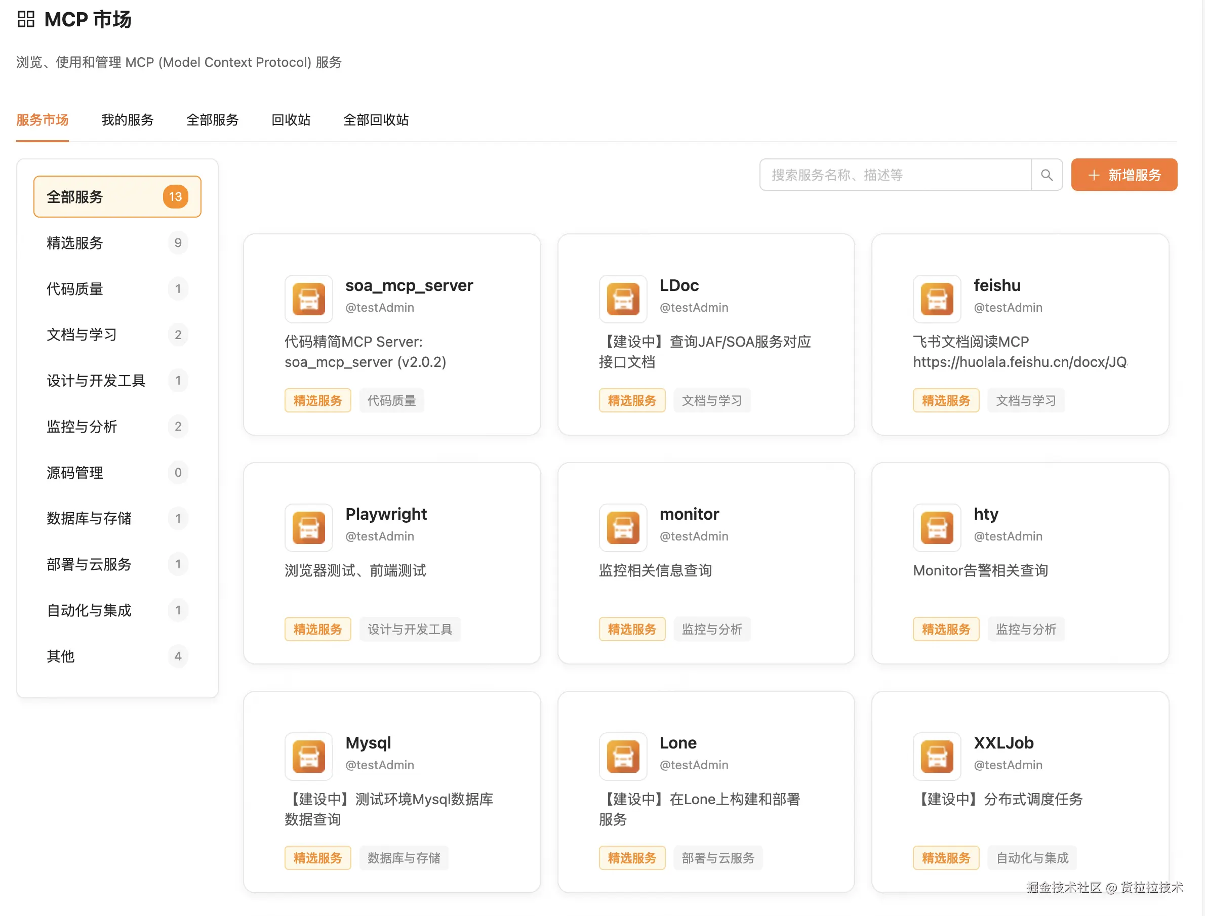 MCP 服务市场平台具备 MCP 服务发布能力,同时汇聚了代码质量、文档、监控等多个领域的精选服务,致力于打造属于货拉拉的 MCP 生态平台。