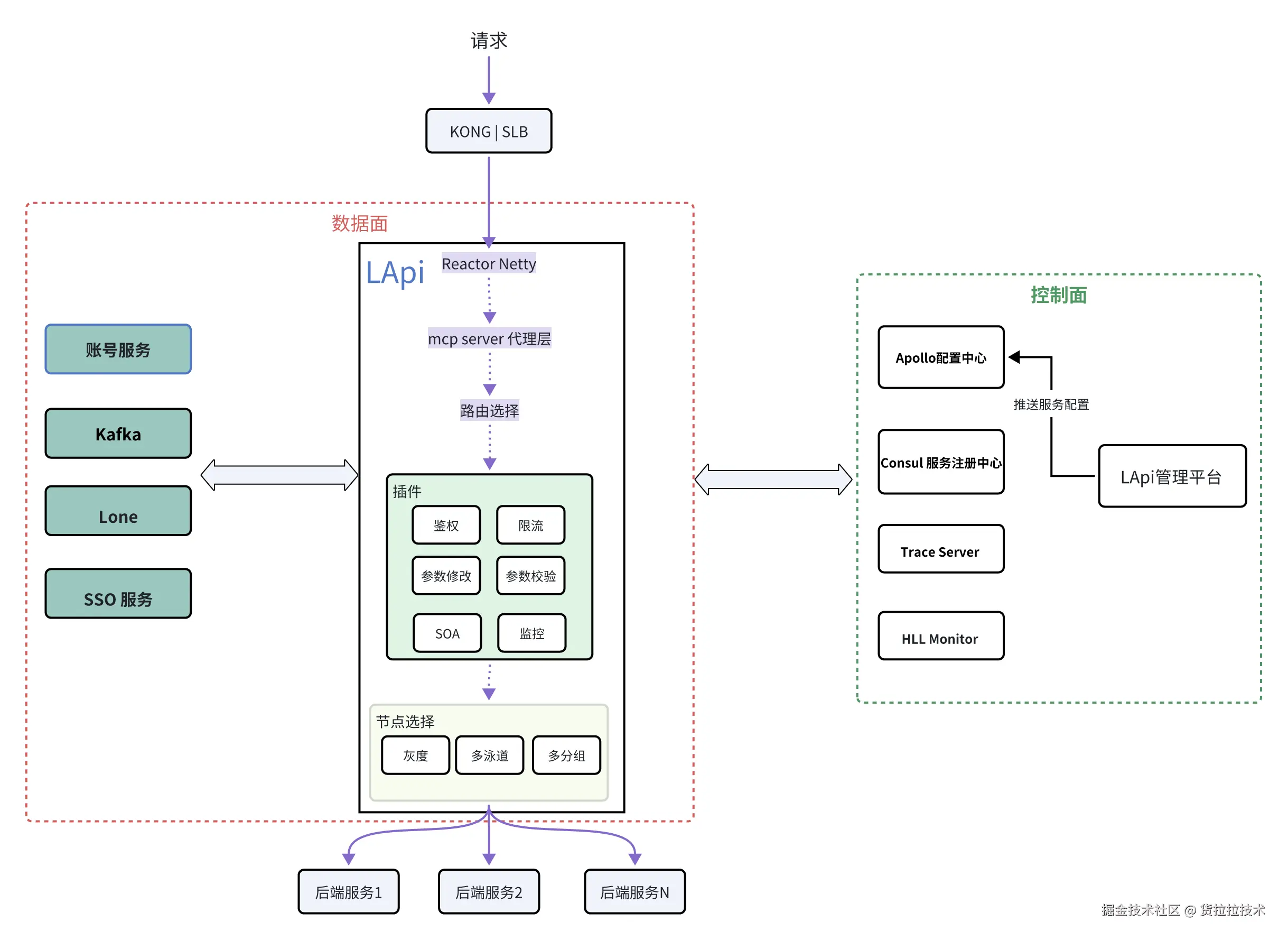 LApi数据面,请求经过入口处的负载均衡(KONG、SLB)到达LApi节点,在LApi内部经过一系列的插件处理后,被转发到下游服务节点。