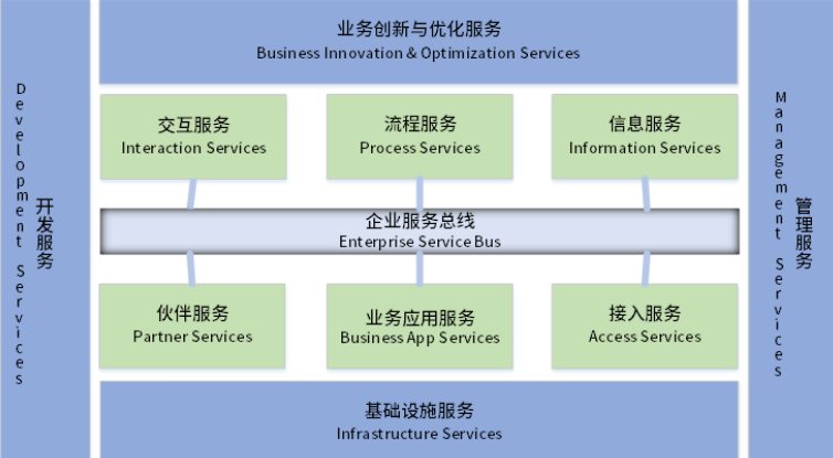 4、业务应用服务(Business App Services)指那些通过新的计算平台JavaEE来实现的新应用,它们所实现的功能和信息也都转化为服务提供出来。在业务流程需要与外部的合作伙伴、供应商交互的情况下,伙伴服务(PartnerServices)提供文档、协议以及伙伴管理的能力,比如说,可以提供企业边界处不同安全级别差异的转换。