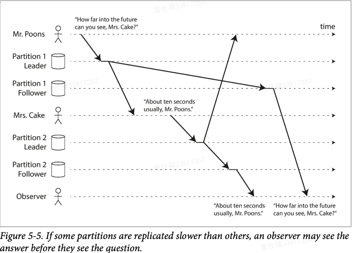 这个问题会比前面的例子看上去更荒唐,这里有两个写入客户端,其中Poons问了个问题,然后Cake做出了回答。从顺序上,MrsCake是看到Poons的问题之后才进行的回答,但是问题与回答恰好被划分到了数据库的两个分区(Partition)上,对于下面的Observer而言,Partition1的Leader延迟要远大于Partition2的延迟,因此从Observer上看到的是现有答案后有的问题,这显然是一个违反自然规律的事情,如果能避免这种问题出现,那么可称为系统实现了"前缀读一致性"。