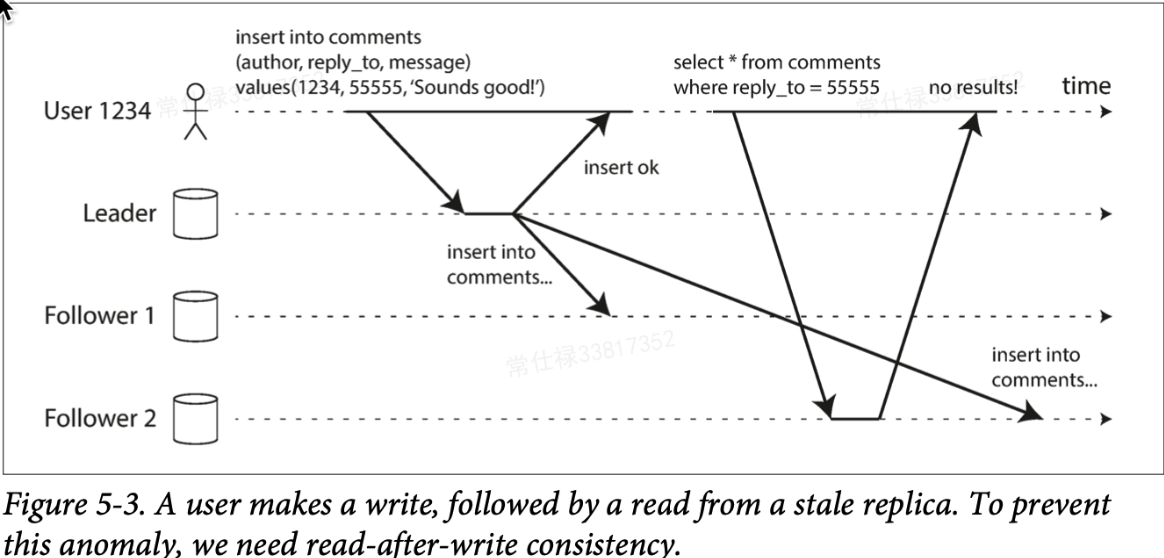 这里我们首先回到上一篇中讲的复制的滞后性,滞后性所带来的的一个最直观的问题就是,如果在复制期间客户端发起读请求,可能不同的客户端读到的数据是不一样的。这里面书中给了三种不同类型的一致性问题。我们分别来看这些事例: