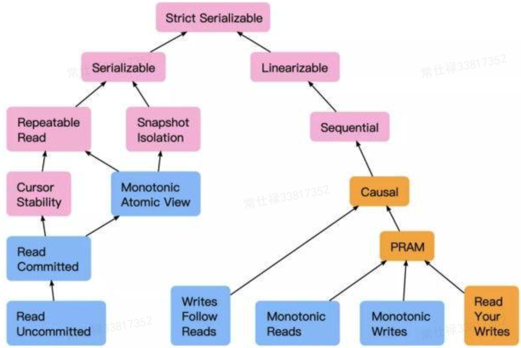 所以我们知道,线性一致性和串行化是两个正交的分支,分别表示外部一致性中的最高级别以及内部一致性的最高级别。如果真的实现这个,那么用户操作这个系统会非常轻松。但很遗憾,达成这两方面的最高级别都有非常大的代价,因此由着这两个分支衍生出各种的内部一致性和外部一致性。