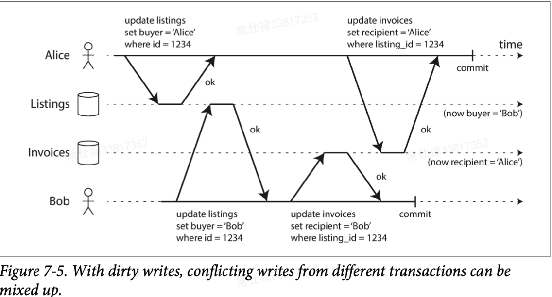 这里同样给个实例,对于一个二手车的交易,需要更新两次数据库实现,但有两个用户并发的进行交易,如果像图中一样不禁止脏写,就可能存在销售列表显示交易属于Bob但发票却发给了Alice,因为两个事务对于两个数据的相同记录互相覆盖。