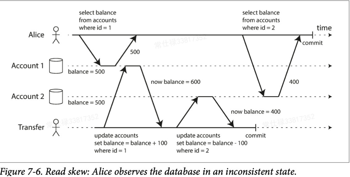 直接上例子,Alice在两个银行账户总共有1000块,每个账户500,现在她想从一个账户向另一个账户转账100,并且她想一直盯着自己的两个账户看看钱是否转成功了。不巧的是,他第一次看账户的时候转账还没发生,而成功后只查了一个账户的值,正好少了100,所以最后加起来会觉得自己少了100元。